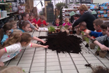 W dniu 12.03.2015 dzieci z oddziału przedszkolnego pojechały na wycieczkę do Centrum Ogrodniczego „Szarotka”, w którym mogły zobaczyć pierwsze wiosenne kwiaty oraz obejrzeć wyposażenie sklepu ogrodniczego. Szczególne zainteresowanie dzieci wzbudzały kosiarki oraz sprzęt ciężki do utrzymania ogrodów. Pani Ania, kierowniczka sklepu, oprowadzała nas po zakamarkach sklepu i pokazywała nam różne nasiona warzyw i kwiatów, odżywki dla roślin oraz akcesoria ogrodnicze, tłumaczyła do czego służą i odpowiadała na wszystkie pytania przedszkolaków. W kolejnej części zajęć dzieci miały okazję pobawić się w ogrodników i posadzić cebulki krokusów, tulipanów i narcyzów w "czarodziejskich" doniczkach, które znikają po wkopaniu do ziemi. Każde dziecko otrzymało zadanie posadzenia roślinki w swoim ogrodzie i obserwowania co pojawi się w miejscu wkopania doniczki. Dodatkowe kwiatki, które otrzymaliśmy w prezencie, posadziliśmy przed budynkiem naszej szkoły.