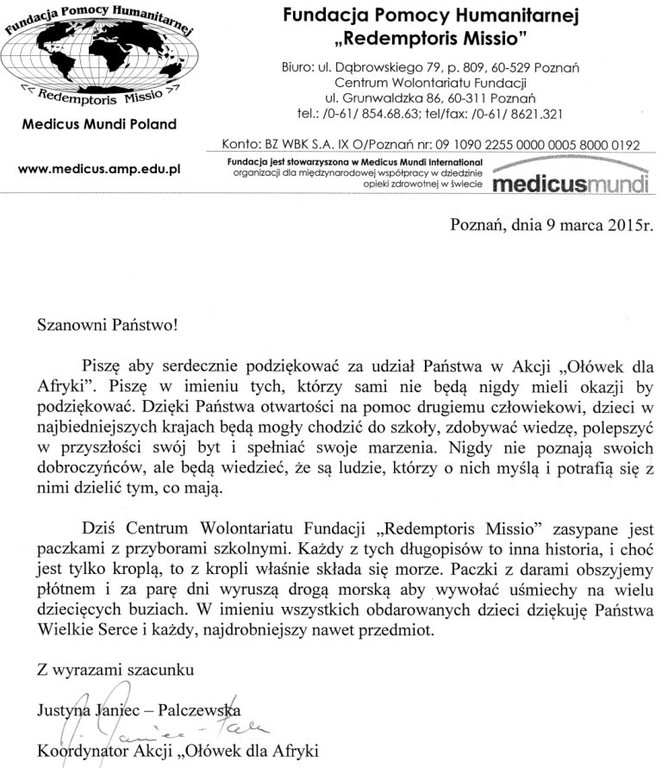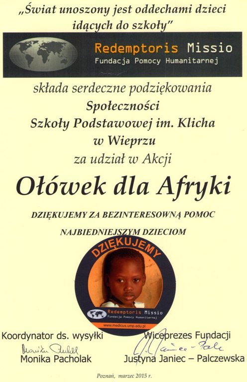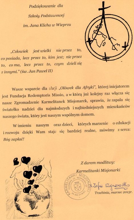 Za wsparcie akcji „Ołówek dla Afryki” nasza szkoła otrzymała gorące podziękowania od Zgromadzenia Karmelitanek Misjonarek z Trzebini oraz z Fundacji Pomocy Humanitarnej „Redemptoris Missio” z Poznania.