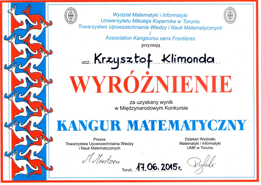 Wyróżnienie w Międzynarodowym Konkursie Matematycznym KANGUR 2015