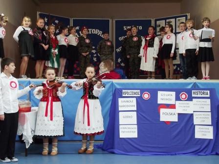 Tegoroczną akademię z okazji Święta Niepodległości przygotowali uczniowie klas czwartych pod opieką wychowawczyń Jolanty Brandys i Moniki Owsionka oraz pani Lucyny Hankus, nauczyciela muzyki. O piękne dekoracje zadbała Pani Izabela Dudek.