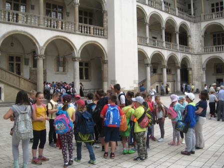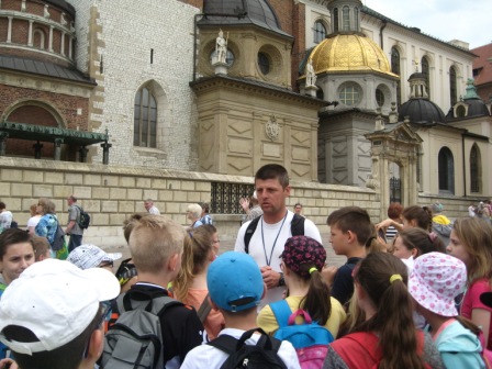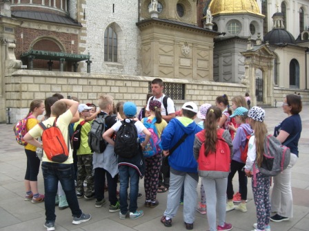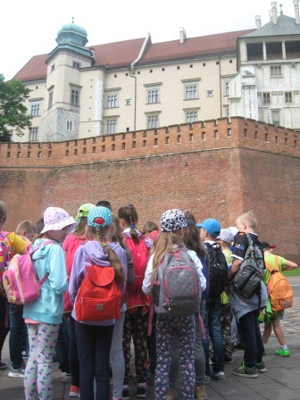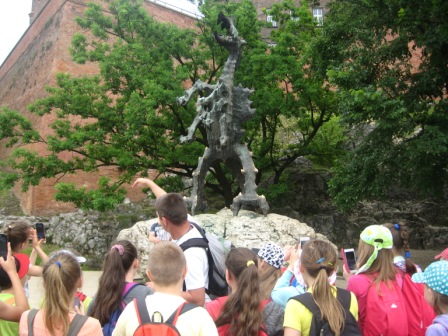 30 maja klasy czwarte odwiedziły piękny, pełen zabytków Kraków. Wcześniej na języku polskim uczniowie poznali legendy związane z miastem, na kółku czytelniczym odbyli wirtualną podróż po najważniejszych częściach miasta, więc do wycieczki byli bardzo dobrze przygotowani. Kraków powitał czwartoklasistów słoneczną pogodą i oczywiście tłumami turystów. Najpierw odwiedzili wawelskiego smoka, następnie wnętrze Katedry i groby sławnych Polaków, a na dziedzińcu zamkowym wysłuchali ciekawych opowieści przewodnika. Z Wawelu drogą królewską udali się na rynek podziwiając po drodze liczne kościoły i piękne kamieniczki. Na rynku wysłuchali legendy o wieży mariackiej i krakowskiego hejnału granego na cztery strony świata. Był czas na zakup pamiątek, obwarzanków i oczywiście wizyta w McDonaldzie. Jednak główną atrakcją wycieczki była wizyta w Muzeum Historycznym pod rynkiem. Z panią przewodnik uczniowie spacerowali po podziemnych korytarzach, ważyli się na średniowiecznej wadze, a na zakończenie trasy mieli okazję własnoręcznie wybić sobie pamiątkową monetę z Krakowa.