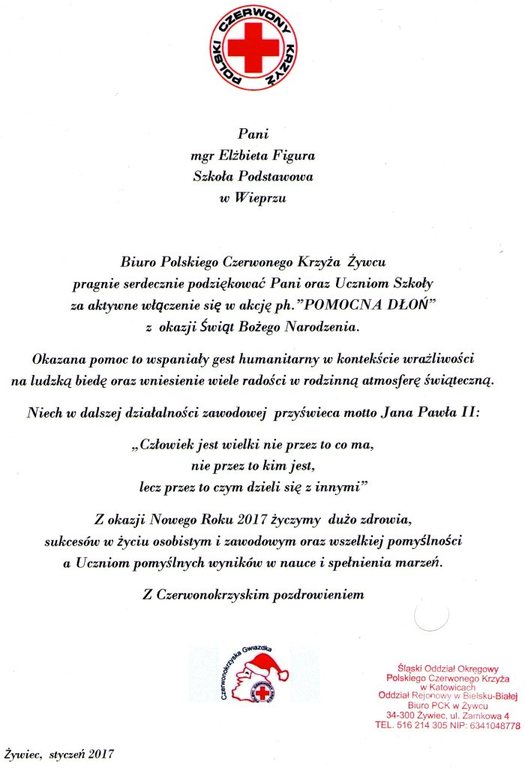 Szkolne Koło PCK pragnie wyrazić wdzięczność wszystkim, którzy włączyli się w przedświąteczną zbiórkę żywności. Za okazane serce, wsparcie oraz wrażliwość na potrzeby drugiego człowieka gorąco DZIĘKUJEMY!!!