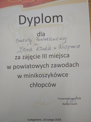 W II semetrze nasza reprezentacja zajęła III miejsce w Powiatowych Zawodach w Minikoszykówce Chłopców. Rozgrywki odbywały się w Łodygowicach. Serdecznie gratulujemy i życzymy dalszych sukcesów!