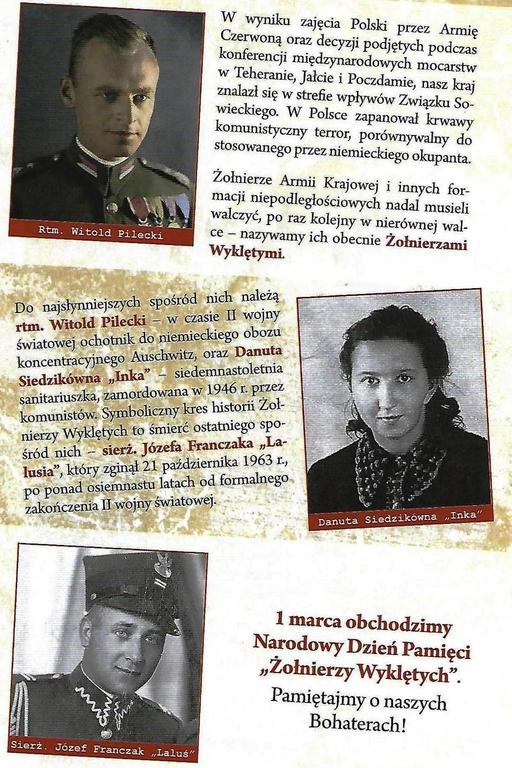 Na zakończenie spotkania każdy uczeń otrzymał dwustronną ulotkę stanowiącą podsumowanie przedstawionej podczas prelekcji wiedzy oraz zakładkę do książki z wizerunkiem jednego z Żołnierzy Wyklętych.