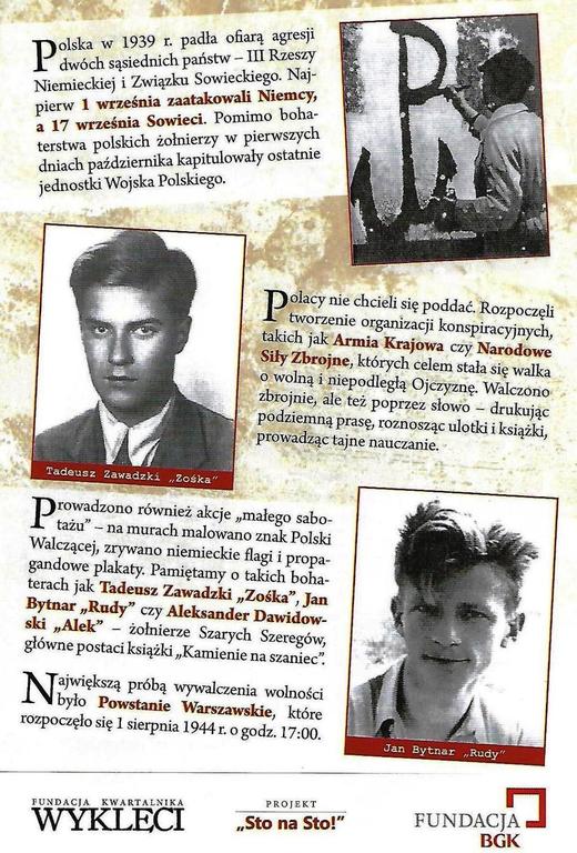 5 listopada 2018 r. Pan Kajetan Rajski, w ramach projektu „Sto na Sto!” (Sto lekcji na Stulecie Odzyskania Niepodległości), przeprowadził w naszej szkole lekcję dla uczniów klas siódmych, ósmych i trzecich gimnazjum poświęconą Żołnierzom Wyklętym. Pan Kajetan Rajski przedstawił losy Żołnierzy Wyklętych, szczególnie rotmistrza Witolda Pileckiego i Danuty Siedzikówny „Inki”, stawiając ich za wzór do naśladowania dla współczesnej młodzieży.