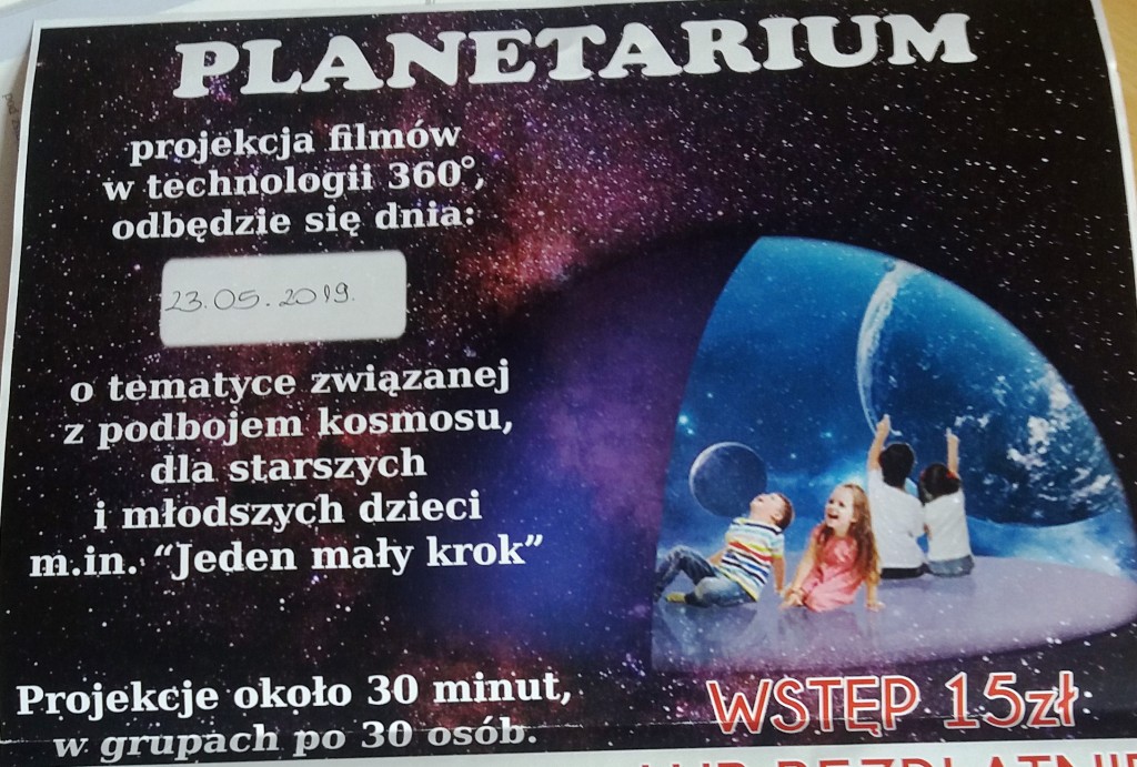 Projekcja filmów w technologii 360° o tematyce związanej z podbojem kosmosu, dla starszych i młodszych dzieci m. in. „Jeden mały krok”, odbędzie się dnia 23.05.2019 r. (czwartek).