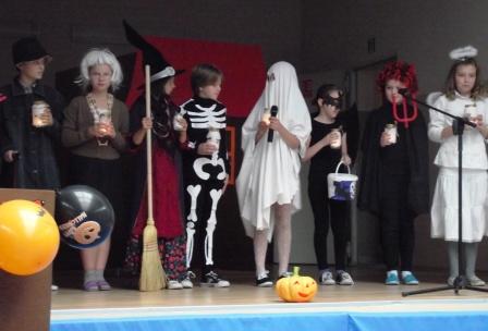 Niedawno obchodziliśmy dzień Wszystkich Świętych – święto upamiętniające zmarłych. W dniu dzisiejszym, 5.11.2013 młodzi aktorzy z klasy czwartej pod kierunkiem Pani mgr I. Dudek przedstawili nam jedną z najsłynniejszych legend Irlandii. W języku polskim i angielskim opowiedzieli nam historię Jacka, który utrzymywał kontakty z diabłem i za swe niegodziwości został ukarany wieczną tułaczką po świecie, drogę oświetla mu latarnia wykonana z dyni rozświetlana węglem z ogni piekielnych. Taką latarnię mieszkańcy Wielkiej Brytanii, Irlandii i Stanów Zjednoczonych kładą na parapetach swoich domów w wigilię Wszystkich Świętych.