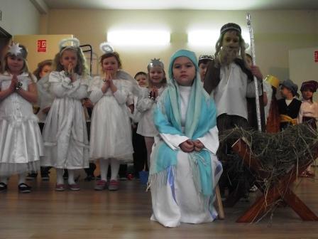 20 grudnia 2013 był szczególnym dniem dla naszych uczniów, zwłaszcza dla przedszkolaków, którzy debiutowali na szkolnej scenie. Wystawili piękne jasełka z elementami folkloru, śpiewając kolędy i winszując w gwarze naszego regionu. Zaskoczyli nas nietuzinkowymi strojami, głośnym, wesołym śpiewem oraz obszernym programem, który bez wątpienia wymagał wiele pracy i wysiłku ze strony naszych najmłodszych uczniów. Tradycyjną szopkę Betlejemską odwiedzili pasterze i góralki w strojach regionalnych ofiarując Dzieciątku to, co najlepsze w góralskiej spiżarni.